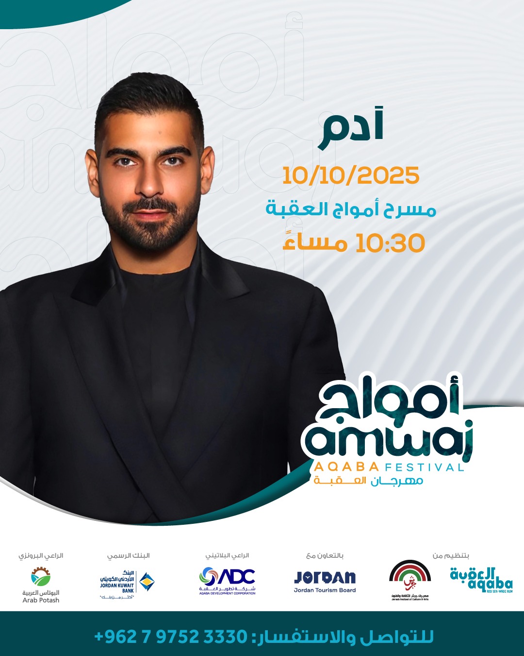 ديرتنا – يحيي الفنان اللبناني ” آدم ” حفلاً غنائيًا قريباً في العقبة ، ضمن فعاليات ” مهرجان أمواج العقبة…
