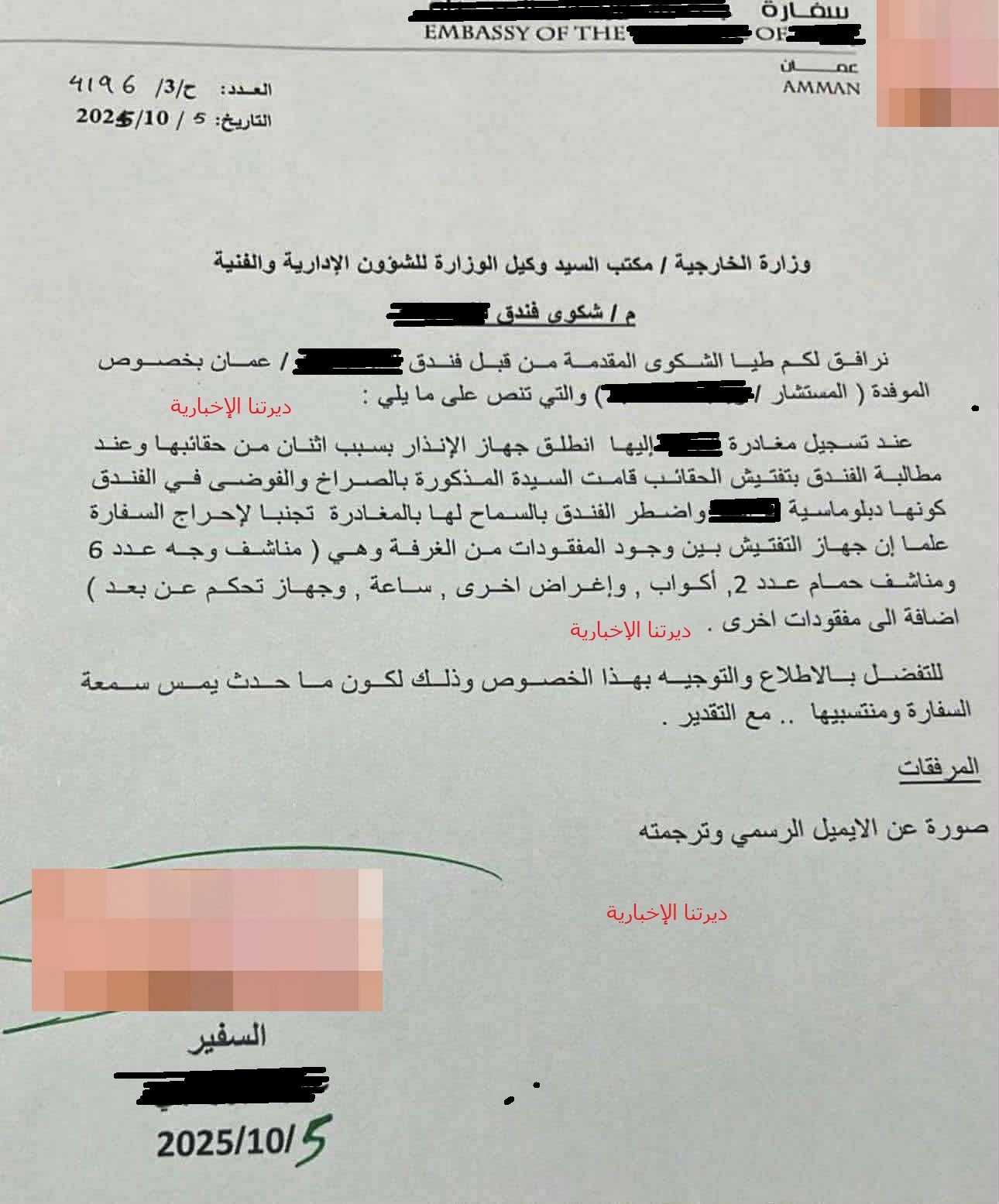 دبلوماسية عربية تتمتع بحصانة متهمة بسرقة محتويات من غرفة فندق فاخر في عمّان وسفير بلادها يرفع أمرها لوزراته – وثيقة