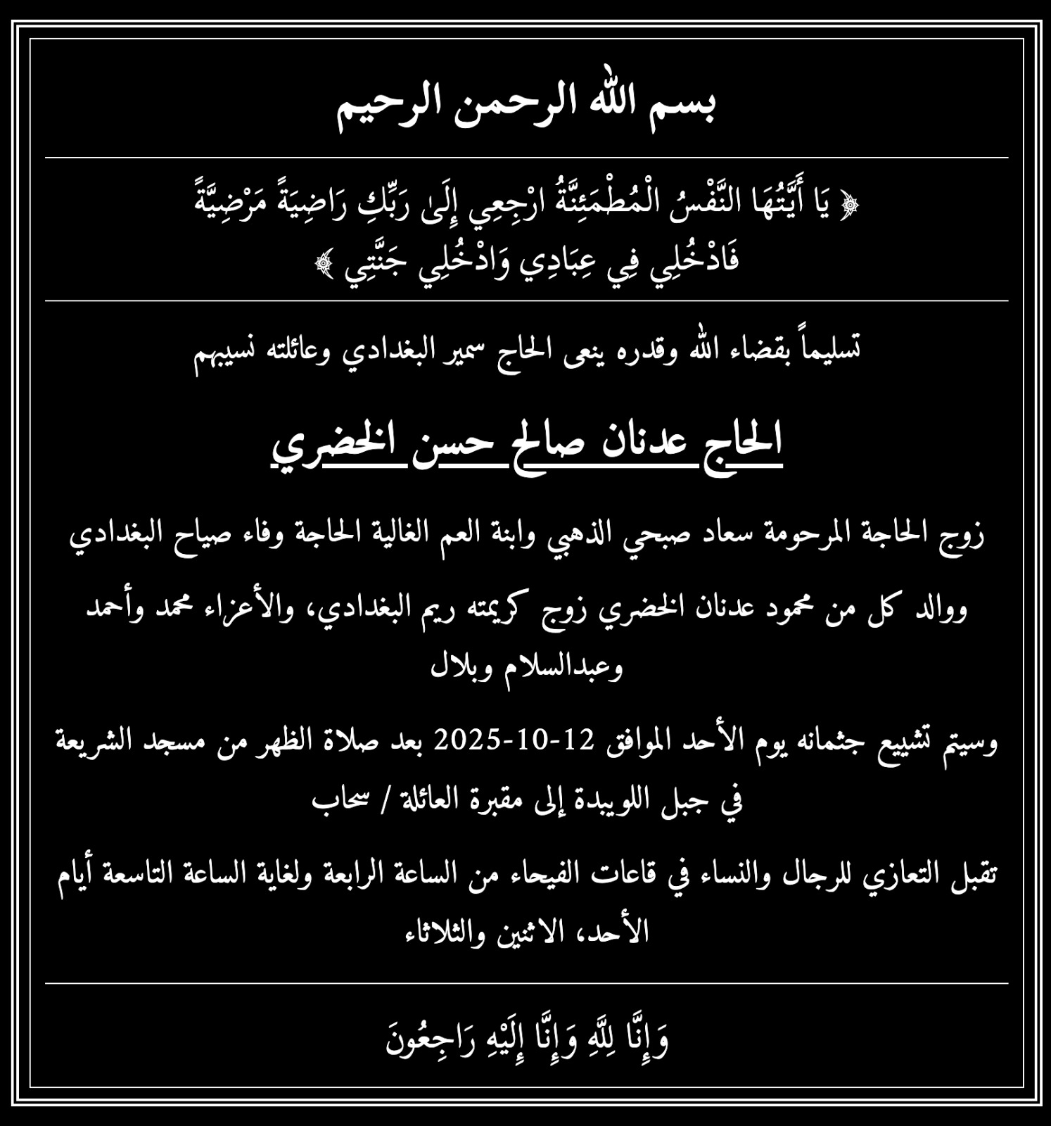 الرئيسية/اعلى الصفحة/نعي فاضل..الحاج عدنان صالح حسن الخضري في ذمة الله اعلى الصفحةالرئيسيوفيات نعي فاضل..الحاج عدنان صالح حسن الخضري في ذمة الله 12 أكتوبر، 2025 شاركها فيسبوك X واتساب ديرتنا – عمّان 12 أكتوبر، 2025 شاركها فيسبوك X واتساب
