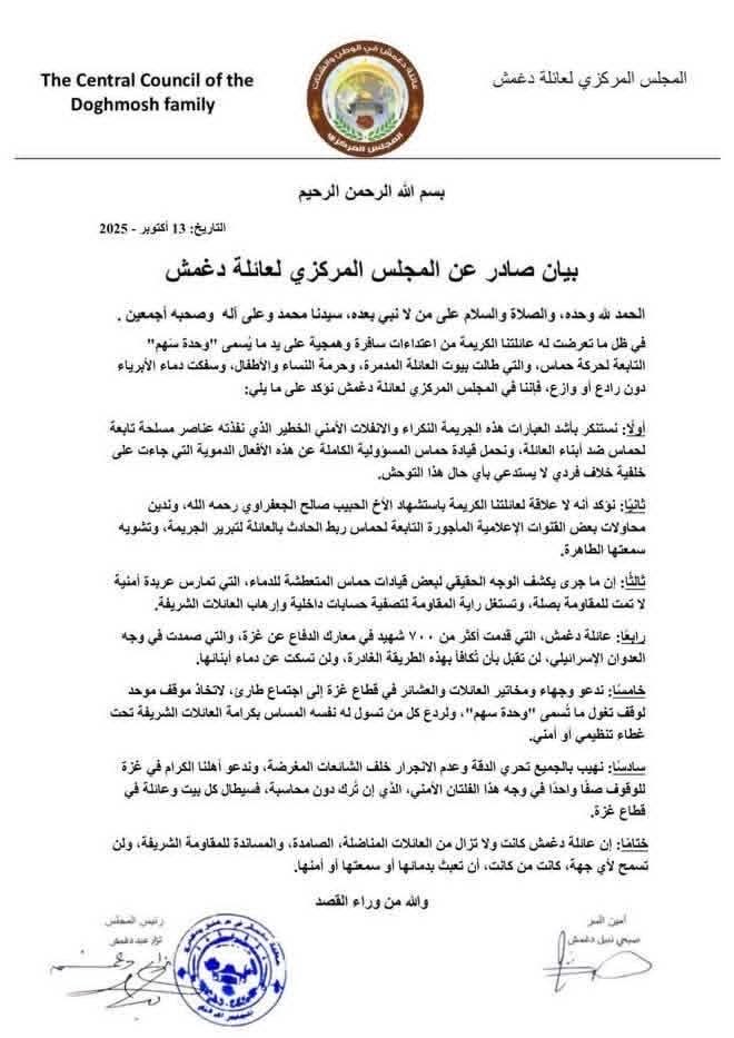 ديرتنا - تناقل نشطاء مواقع التواصل ، بيانا منسوبا لعائلة دغمش الغزيّة ، تاليا نصه :